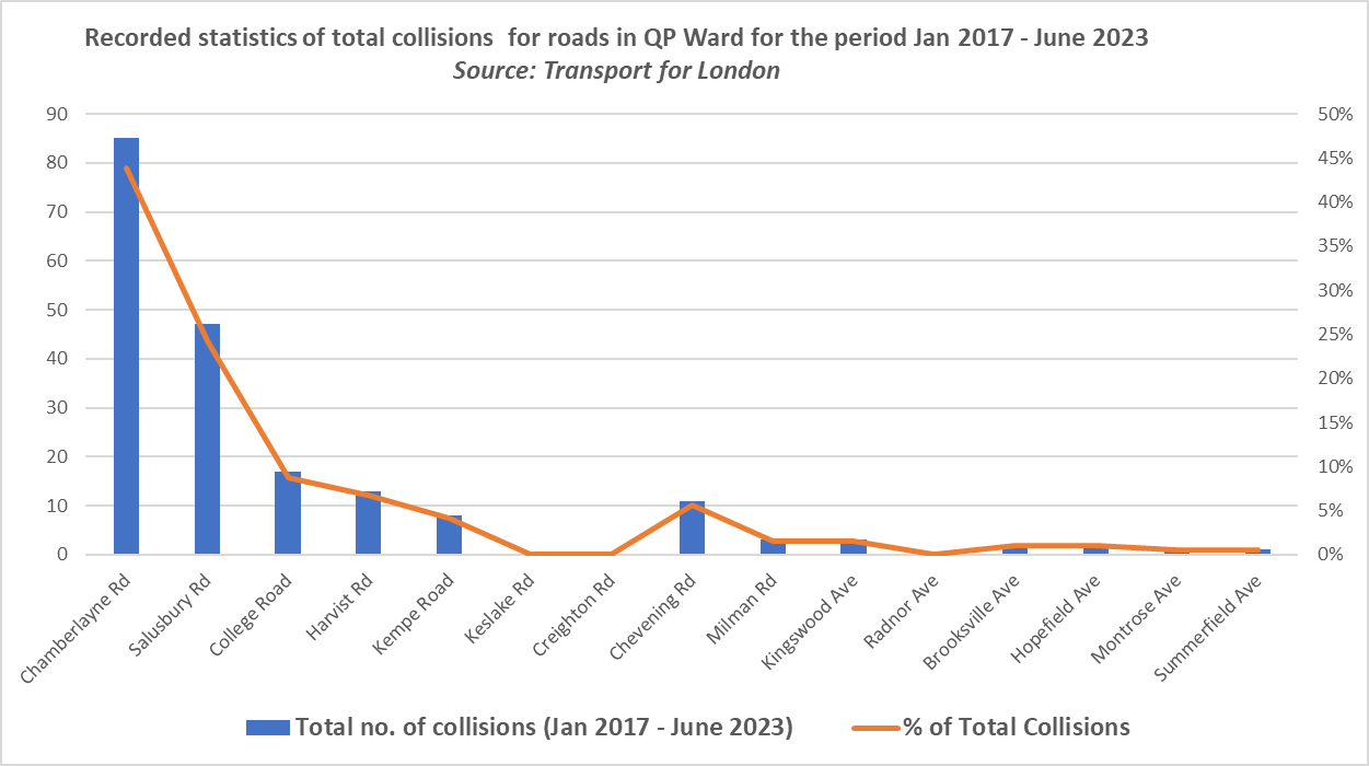 Between January 2017 and June 2023, there were 85 collisions on the 0.9 mile Chamberlayne Road. Compare that to 47 on Salusbury Road and collision stats for other roads in the Queens Park Ward. Source: TfL